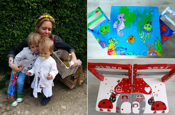 Fabiola picteaza scaune cu modele personalizate de doi ani si s-a bucurat practice de un succes imediat. Acum, de abia mai face fata cererilor. Are doi copii nazdravani (un baietel de 4 ani si o fetita de 2), care o mai “ajuta” la pictat.