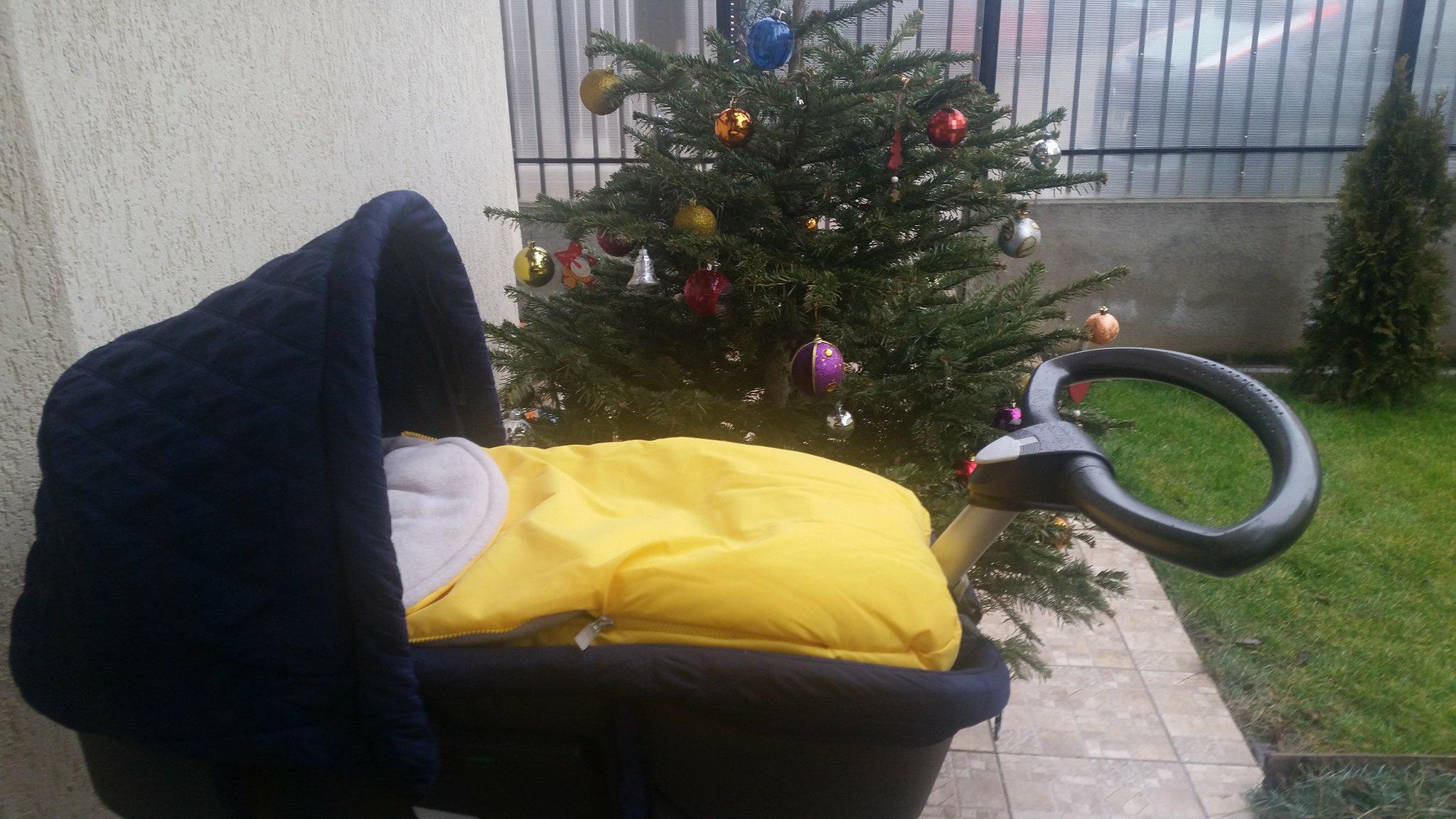 De Craciun am fost la niste prieteni chiar la pranz, cand era somnul lui bebe. Ne faceam griji ca nu va dormi, ca va trebui sa il tinem in brate non stop. Spre bucuria noastra, prietenii aveau un balcon urias, din care se vedea perfect din living. Fiind si o zi calduroasa pentru 25 decembrie (in jur de 9-10 grade), l-am scos in scoica pe balcon, unde a dormit fericit trei ore!