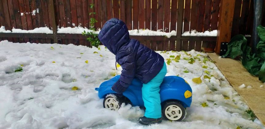 Dupa ce l-am echipat complet, am maxim un minut sa ma imbrac si eu. Geaca, caciula, manusi. De multe ori renunt la accesorii, ca sa nu mai pierd vremea. Minutul asta se agata de mine, de picioarele mele, trage de mine, se impiedica de orice pentru ca nu vrea sa stea in picioare, are chef de scandal, cade pe jos, plange tare… Cand iesim afara, se mai linisteste, dar dureaza un pic pana ii trece supararea.