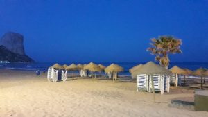La plaja ajungeam cu masina – cam 5-10 minute de mers. Plaja frumoasa, intinsa, strajuita de o stanca masiva (Ifach), care face peisajul sa fie superb. Totusi destul de aglomerata, ce-i drept, dar curata, amenajata, lunga si suficient de lata, marginita de o sumedenie de restaurante, baruri, cafenele si alte locuri turistice. Marea frumoasa insa nu are albastrul acela ireal al Greciei. Atat plaja cat si intrarea in apa, foarte lina, seamana destul de mult cu Mamaia si e foarte potrivita pentru copii. Nisip fin numai bun pentru castele, restaurant si terase la doi pasi, promenada frumoasa pentru plimbarile de seara.