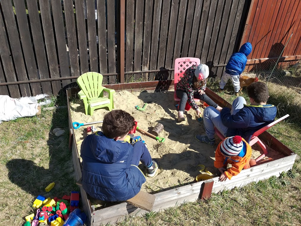 In rest, ne mai jucam in nisip (la niste vecini in gradina), ne plimbam pe strada, ne dam in tobogan etc pana la ora pranzului. Dupa somn, iar afara. De la 16:30 ni se alatura si Andrei care vine de la gradinita. Cat ne permite vremea, stam cu copiii pe strada: altfel trece timpul, iar ei nu mai sunt asa de mofturosi si solicitanti ca in casa.