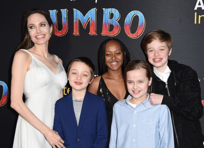 Foto: Angelina Jolie, cu cei trei copii bilogici. Shiloh este cea/cel din stanga, in negru