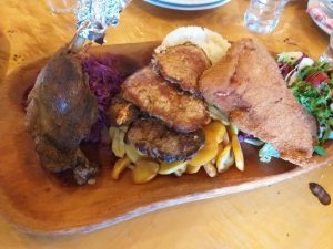 Pentru cei carora le place carnea, Sir Lancelot is the place to be 🙂 Este un restaurant asezat pe trei nivele, specializat in carnuri. Noi am stat la subsol, intr-un décor medieval, cu armuri, cavaleri, arme etc. Platoul de aici a fost spectaculos. Si mult prea mare pentru noi trei 🙂 Ciolan de porc caramelizat, pulpa de rata pe varza, frigarui de pui, aripioare condimentate, muschi de vita invelit in bacon, niste carne de porc extrem de frageda, cartofi, salata, porumb fiert, muraturi. Nebunie 🙂 Ti se pune bavetica la gat, ca la bebelusi 🙂 Aici ne-a costat toata nebunia vreo 60 de euro.